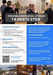 «Ta neste steg» er et praktisk og personlig utviklingsprogram som hjelper deg å se klarere, prioritere riktig og faktisk komme i gang med det som betyr noe. Du jobber med egne mål, egne valg og hva som skal til for å skape ønsket utvikling – både i jobb og i livet ellers.